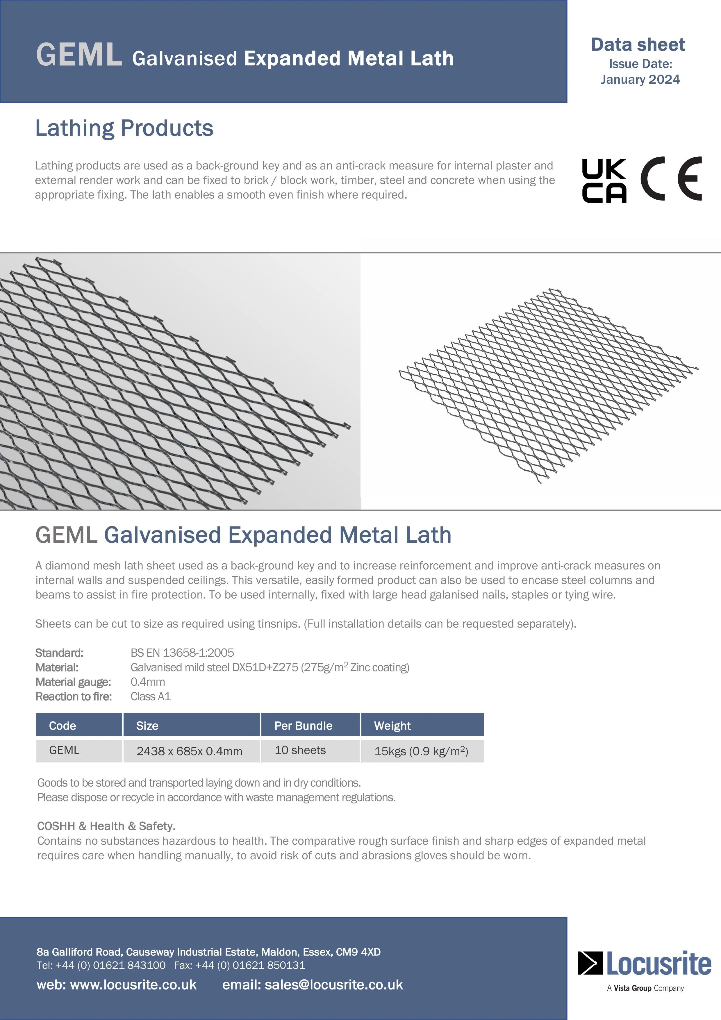 Data sheet for GAML Galvanized Expanded Metal Lath, featuring images of the metal lath, product specifications, standards, and manufacturer contact information.