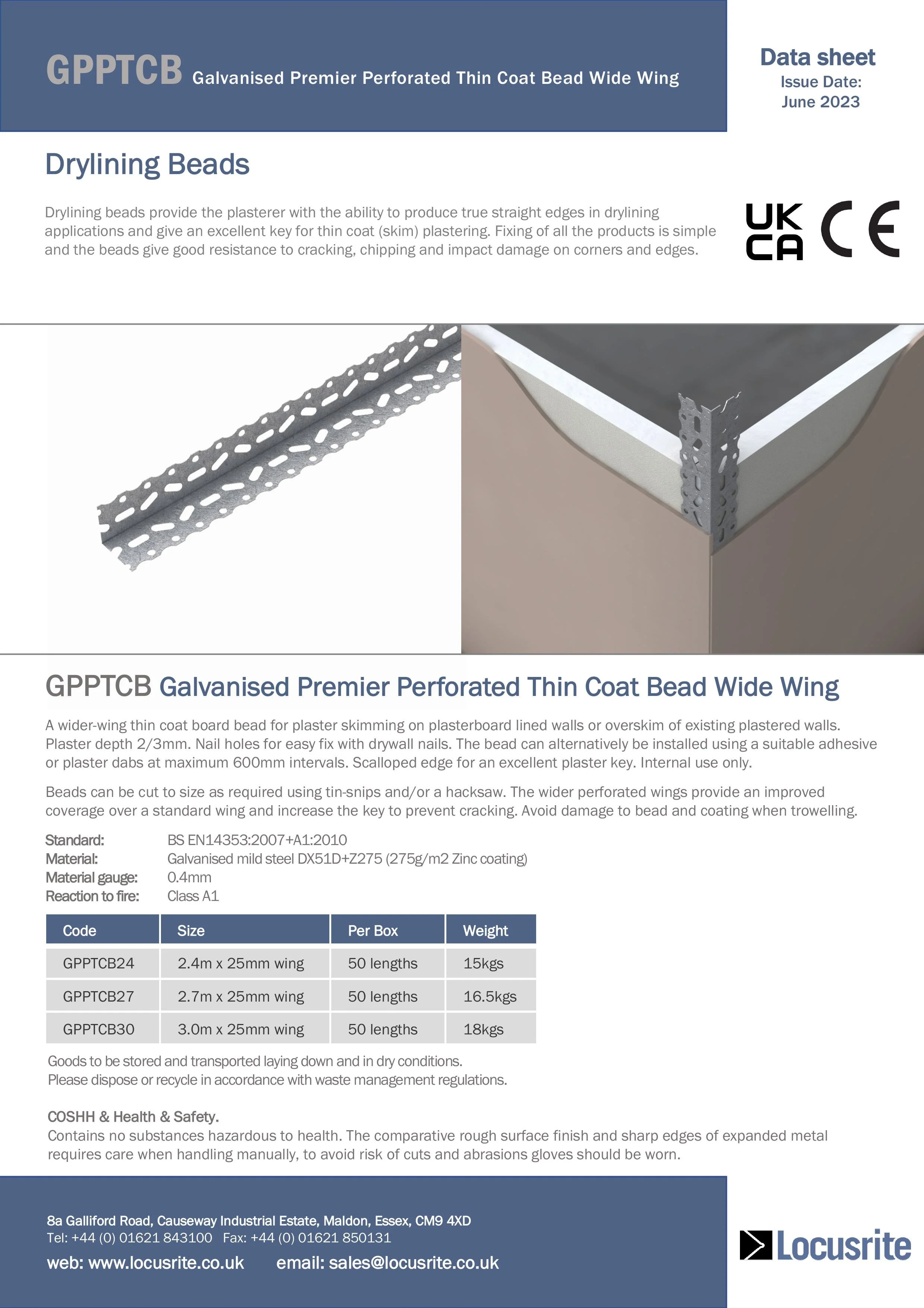 Data sheet for galvanized perforated thin coat bead wide wing, including images of the bead and corner installation, product specifications, and company contact information.