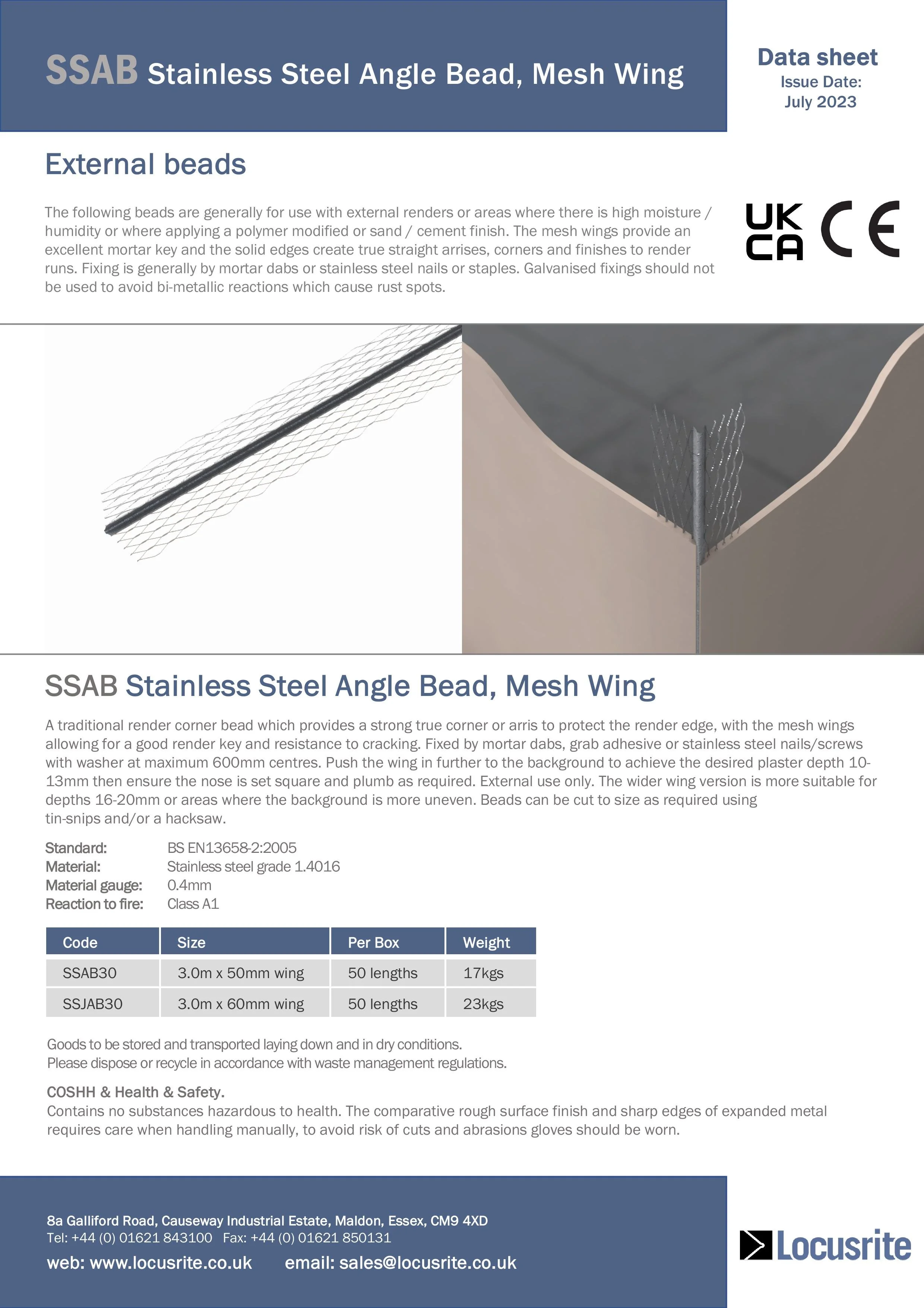 Data sheet for SSAB stainless steel angle bead with mesh wing, detailing product specifications and features.