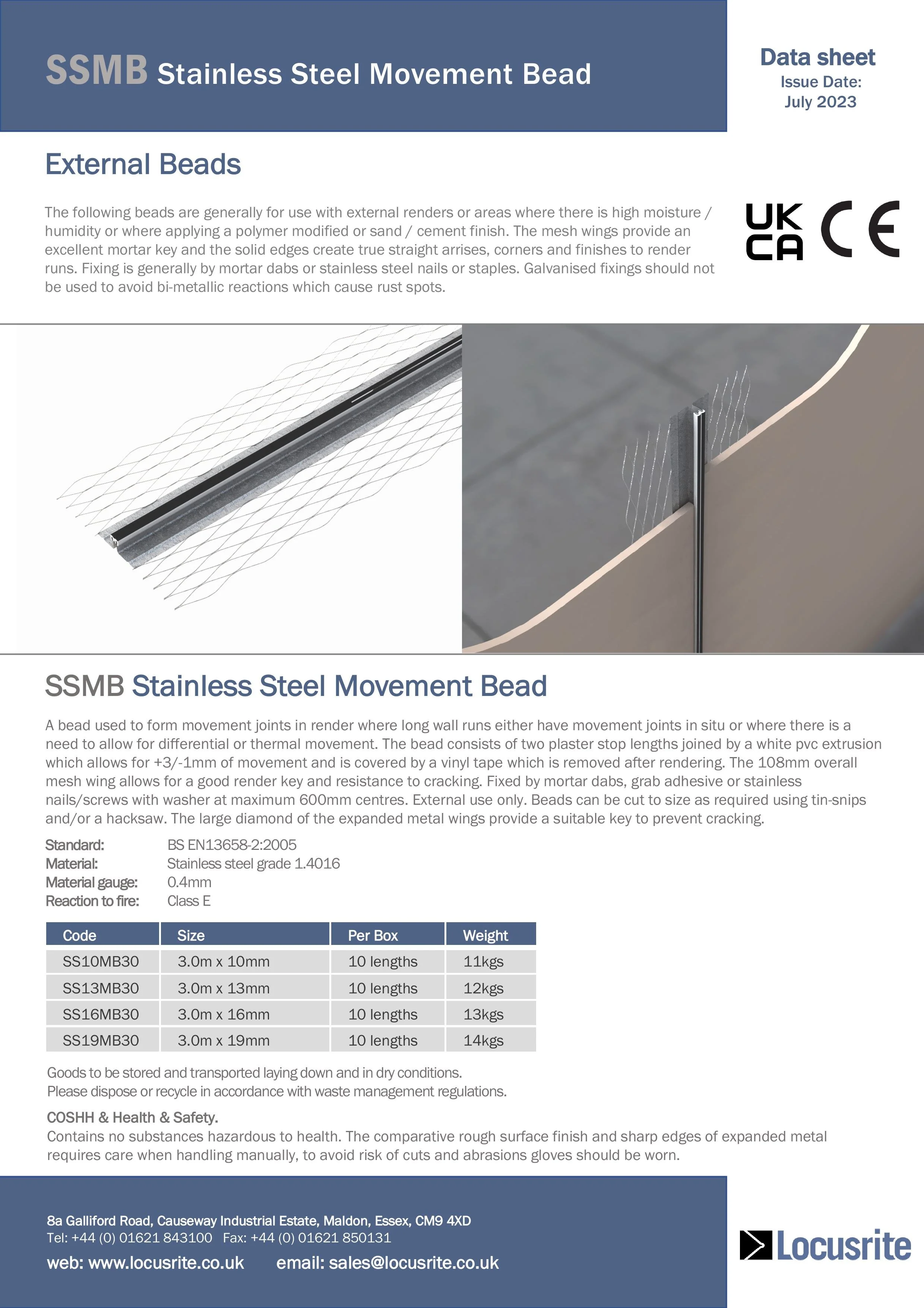 Product information sheet for stainless steel movement beads used in external construction joints, with images of the beads and their installation for stabilization and movement accommodation.