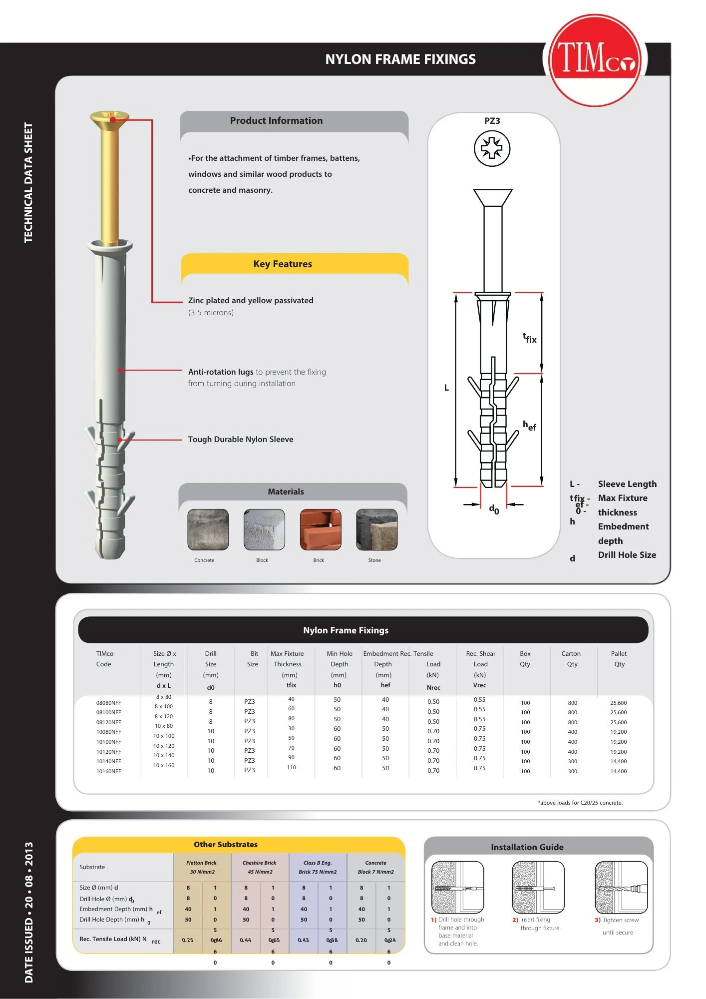 Technical datasheet for nylon frame fixings, showing product details, materials, dimensions, and installation instructions.
