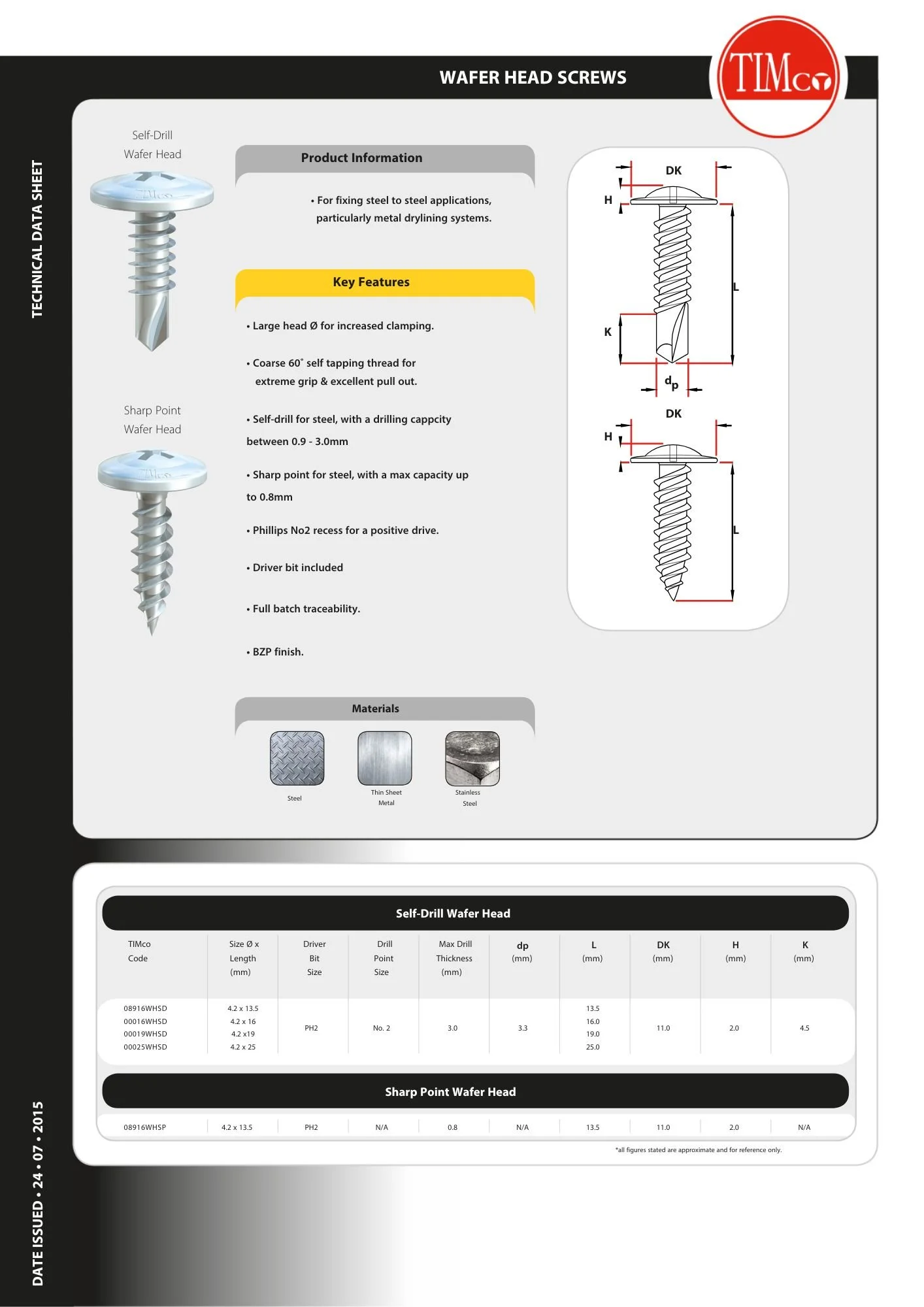 Technical data sheet for wafer head screws with specifications, diagrams, and material options.